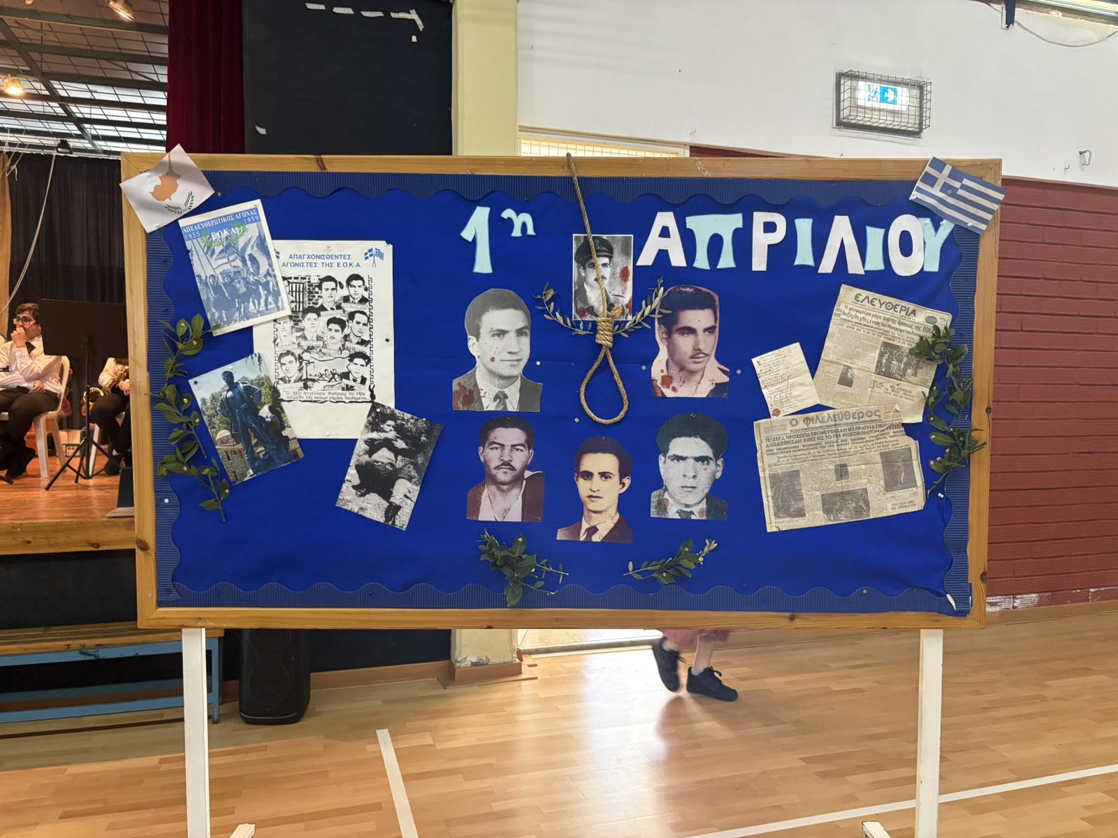 Την Τρίτη 31 Μαρτίου, το Σχολείο μας τίμησε την έναρξη του απελευθερωτικού αγώνα της ΕΟΚΑ εναντίον των Άγγλων αποικιοκρατών. Στη λιτή αλλά συγκινητική εκδήλωση τιμήθηκαν οι γνωστοί και άγνωστοι ήρωες του Αγώνα 1955 - 1959, οι οποίοι θυσιάστηκαν για την πατρίδα μας. Η αλύγιστη ψυχή και το ανυπότακτο τους φρόνημα αναδείχθηκαν στη δύναμη που τους επέτρεψε να αντέξουν στα κρατητήρια, να γίνουν ολοκαυτώματα, να χαράξουν τις δικές τους ανηφοριές και ανεπανάληπτες θυσίες, να γίνουν παράδειγμα, φάροι, πυξίδες και να συμπληρώσουν νέες χρυσές σελίδες στο ένδοξο παρελθόν τους.
