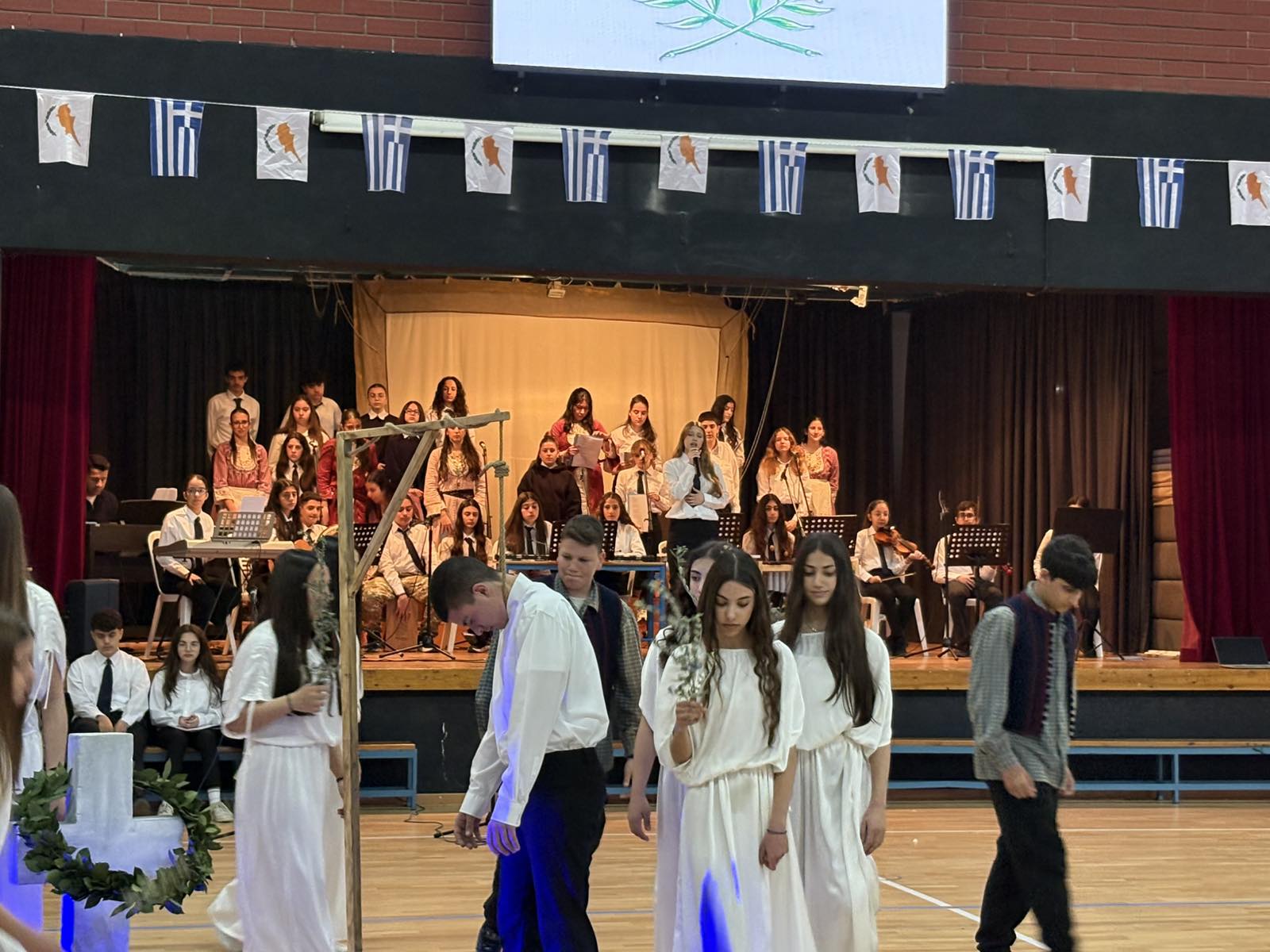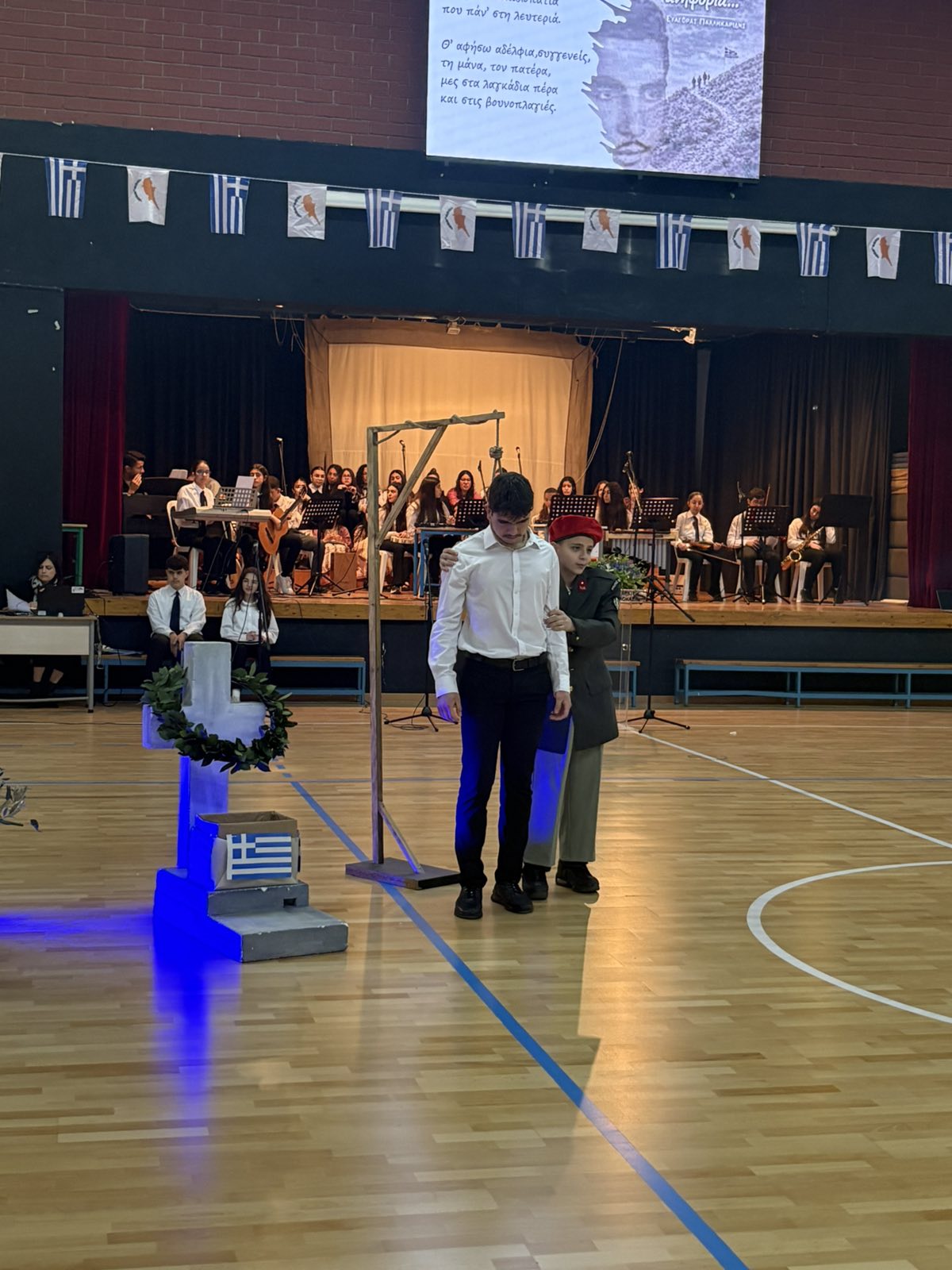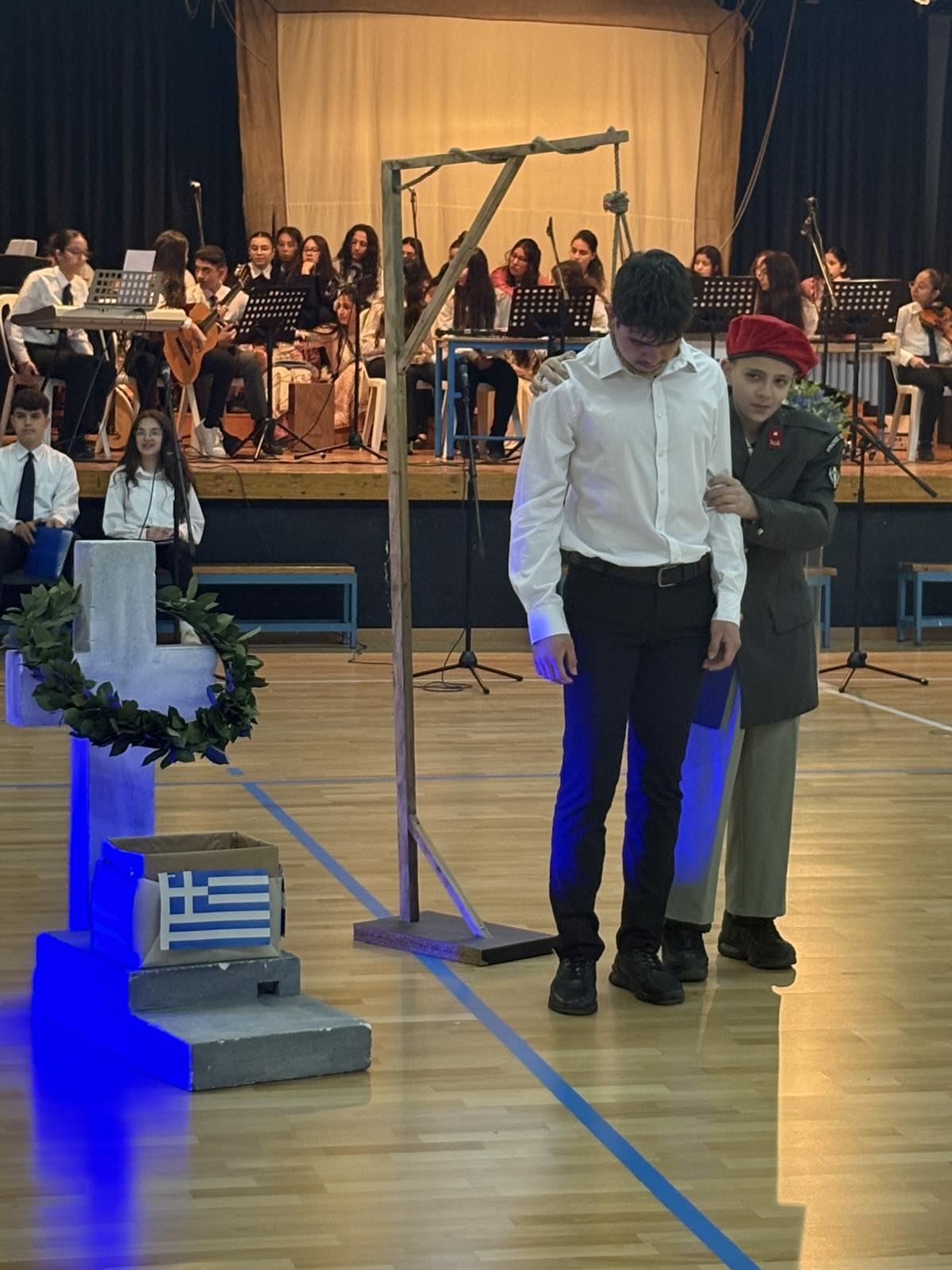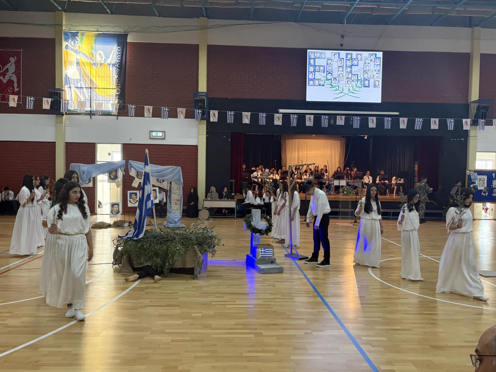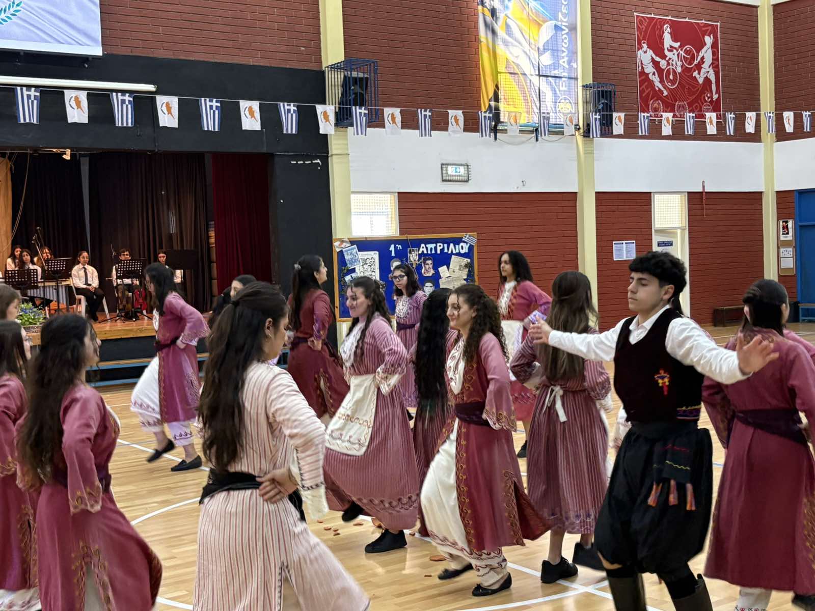 Στη συνέχεια ακολούθησαν παραδοσιακοί κυπριακοί χοροί, τραγούδια από τη χορωδία και την ορχήστρα του Σχολείου μας και δραματοποιημένη απόδοση τιμών στους ήρωες. Στο τέλος μαθητές και μαθήτριες έδωσαν όρκο, ότι θα προσπαθήσουν να φανούν αντάξιοι της θυσίας των ηρώων μας, κλίνοντας ευλαβικά το γόνυ και ευχήθηκαν σύντομα οι θυσίες των ηρώων μας για Ελευθερία να ευοδωθούν!