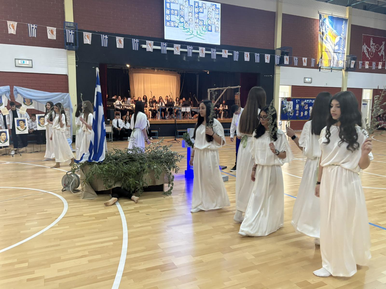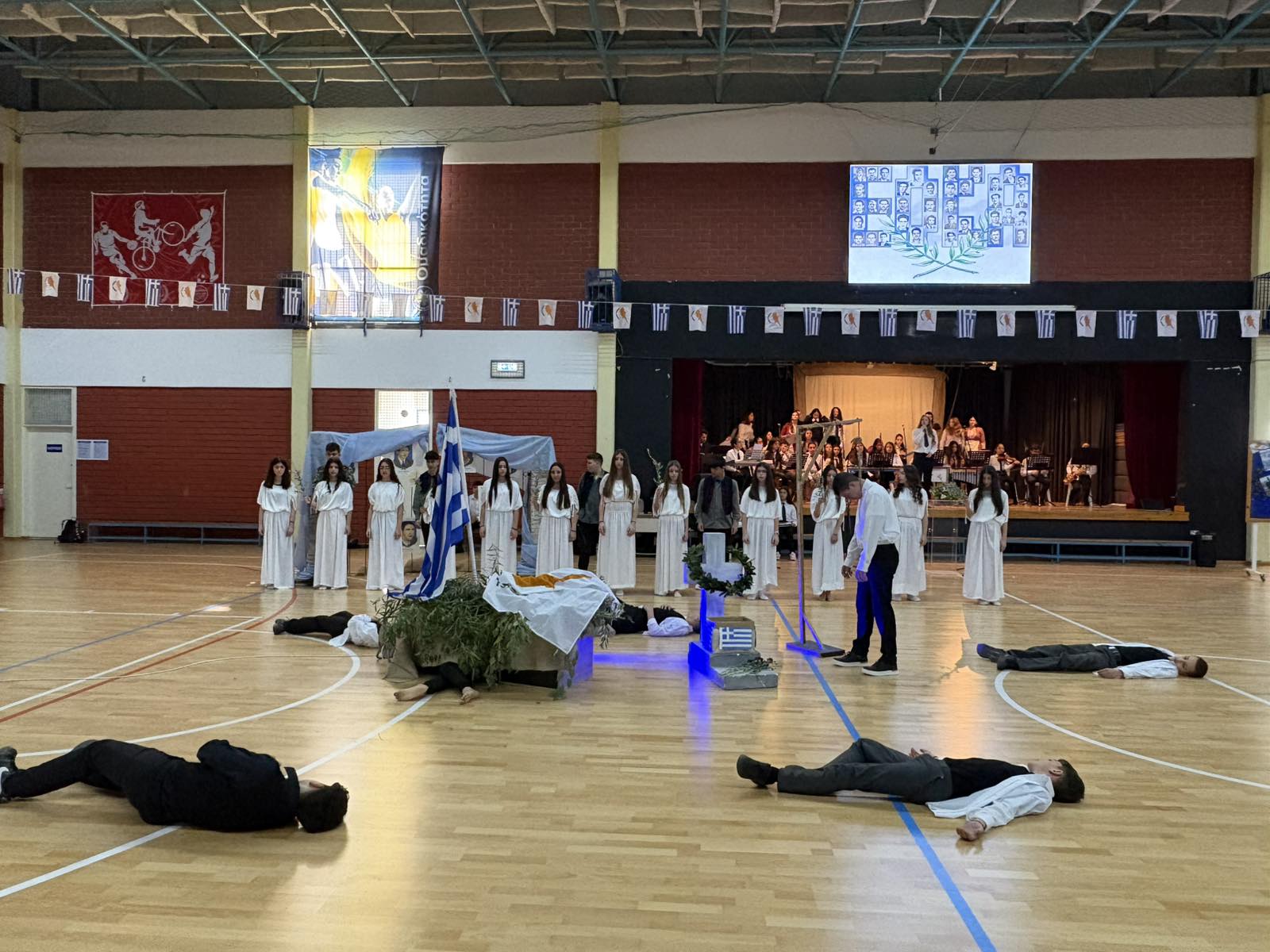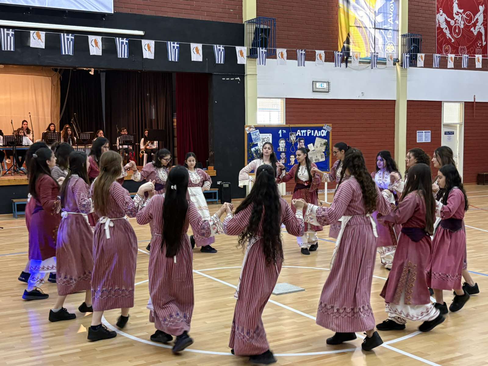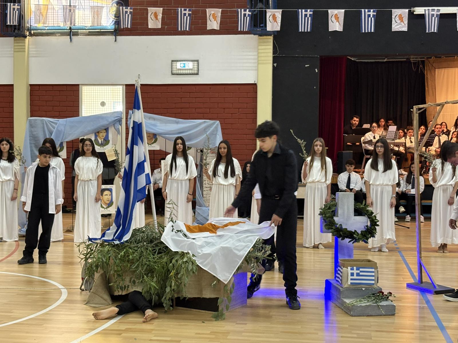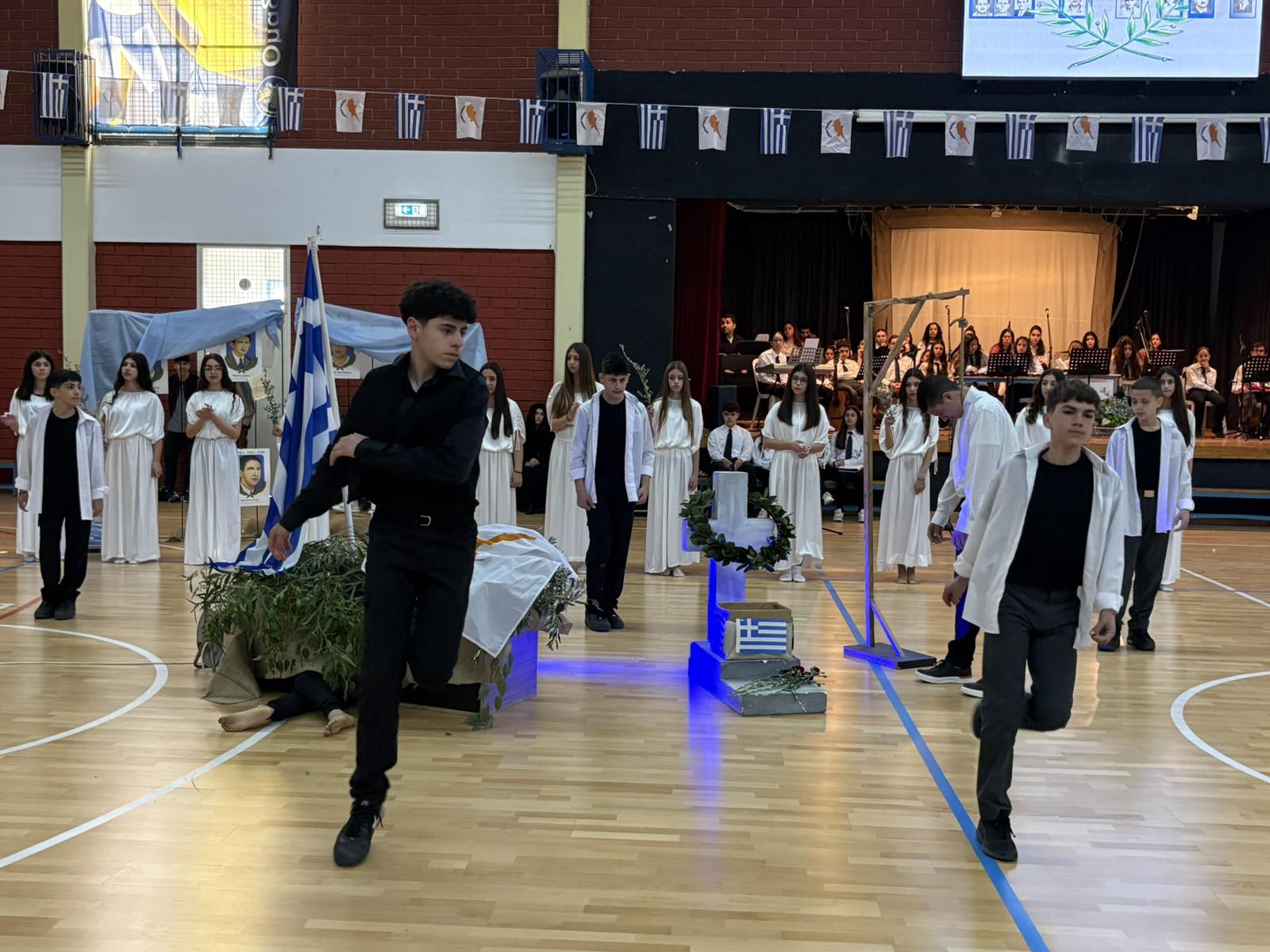 Στη συνέχεια ακολούθησαν παραδοσιακοί κυπριακοί χοροί, τραγούδια από τη χορωδία και την ορχήστρα του Σχολείου μας και δραματοποιημένη απόδοση τιμών στους ήρωες. Στο τέλος μαθητές και μαθήτριες έδωσαν όρκο, ότι θα προσπαθήσουν να φανούν αντάξιοι της θυσίας των ηρώων μας, κλίνοντας ευλαβικά το γόνυ και ευχήθηκαν σύντομα οι θυσίες των ηρώων μας για Ελευθερία να ευοδωθούν!