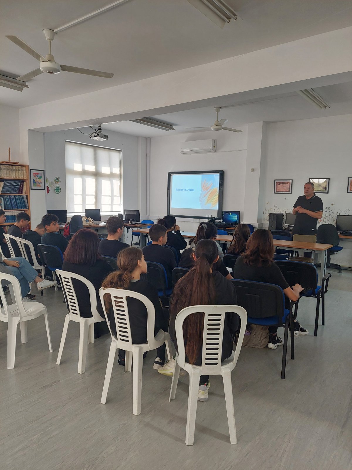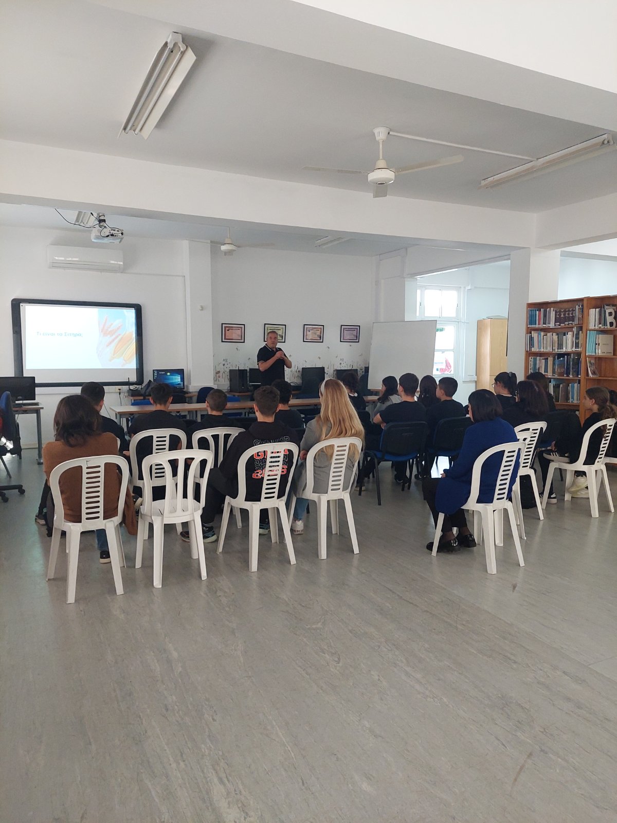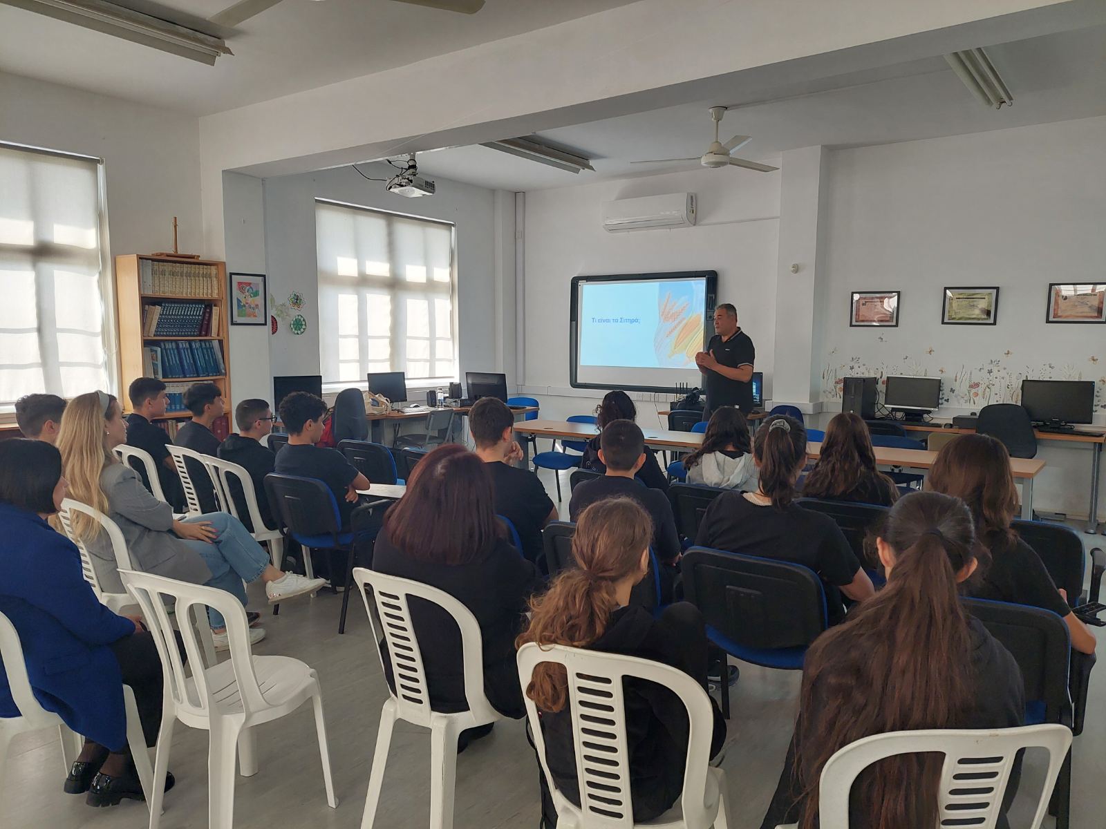 Κατά τη διάρκεια της διάλεξης, οι μαθητές και οι μαθήτριές μας ενημερώθηκαν για τις κύριες καλλιέργειες της Κύπρου, με ειδική αναφορά στα σιτηρά, ενώ έγινε εκτενής συζήτηση για την επίδραση της κλιματικής αλλαγής στην καλλιέργεια και στη βιωσιμότητά τους. Ο κ. Κουρκουράκης ανέδειξε τις προκλήσεις που αντιμετωπίζει ο γεωργικός τομέας, καθώς και τις σύγχρονες πρακτικές που μπορούν να συμβάλουν στη διατήρηση και ενίσχυσή του.