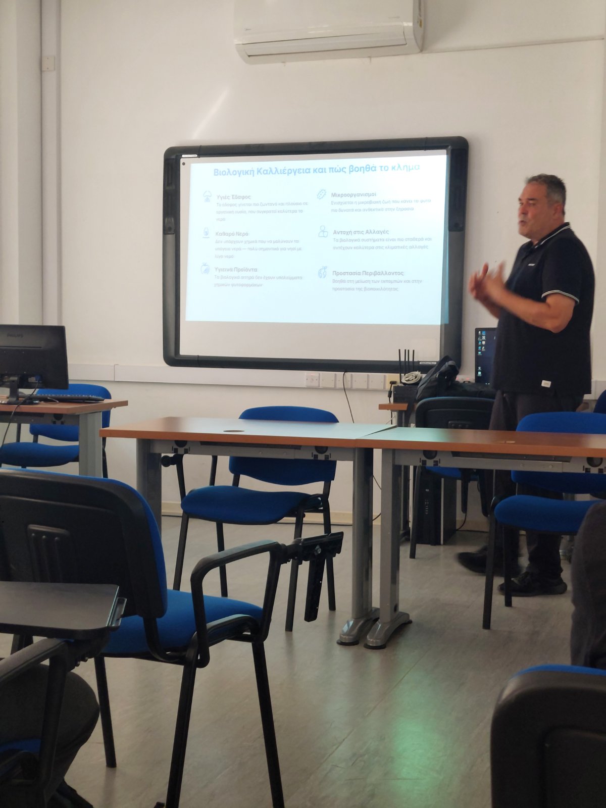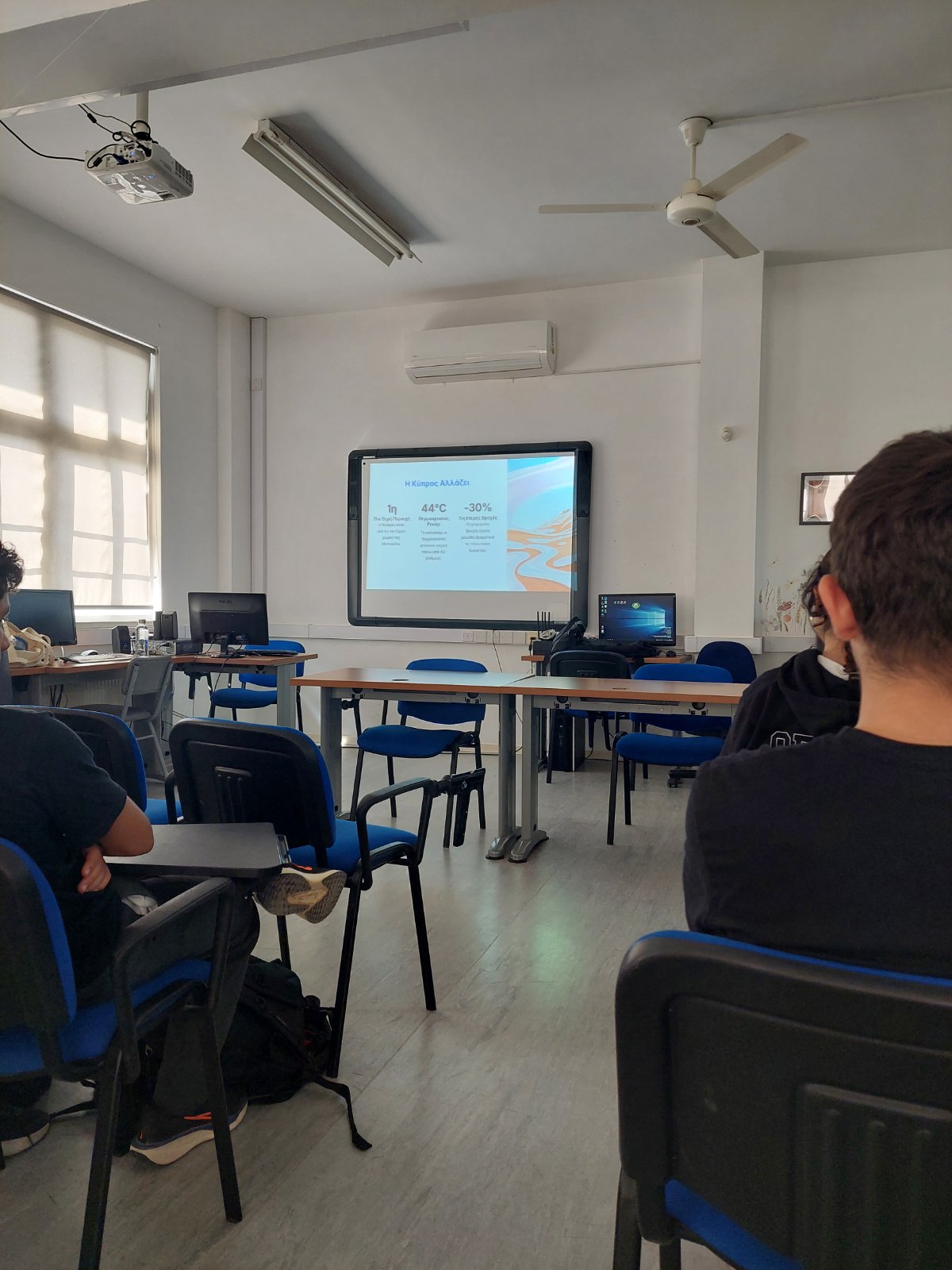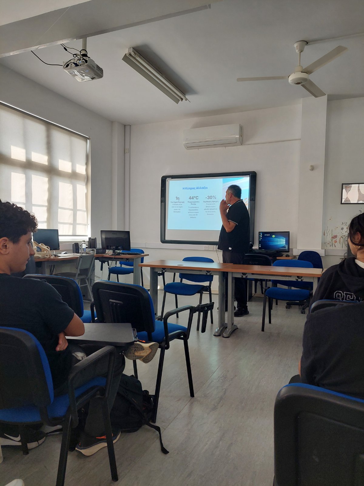 Κατά τη διάρκεια της διάλεξης, οι μαθητές και οι μαθήτριές μας ενημερώθηκαν για τις κύριες καλλιέργειες της Κύπρου, με ειδική αναφορά στα σιτηρά, ενώ έγινε εκτενής συζήτηση για την επίδραση της κλιματικής αλλαγής στην καλλιέργεια και στη βιωσιμότητά τους. Ο κ. Κουρκουράκης ανέδειξε τις προκλήσεις που αντιμετωπίζει ο γεωργικός τομέας, καθώς και τις σύγχρονες πρακτικές που μπορούν να συμβάλουν στη διατήρηση και ενίσχυσή του.