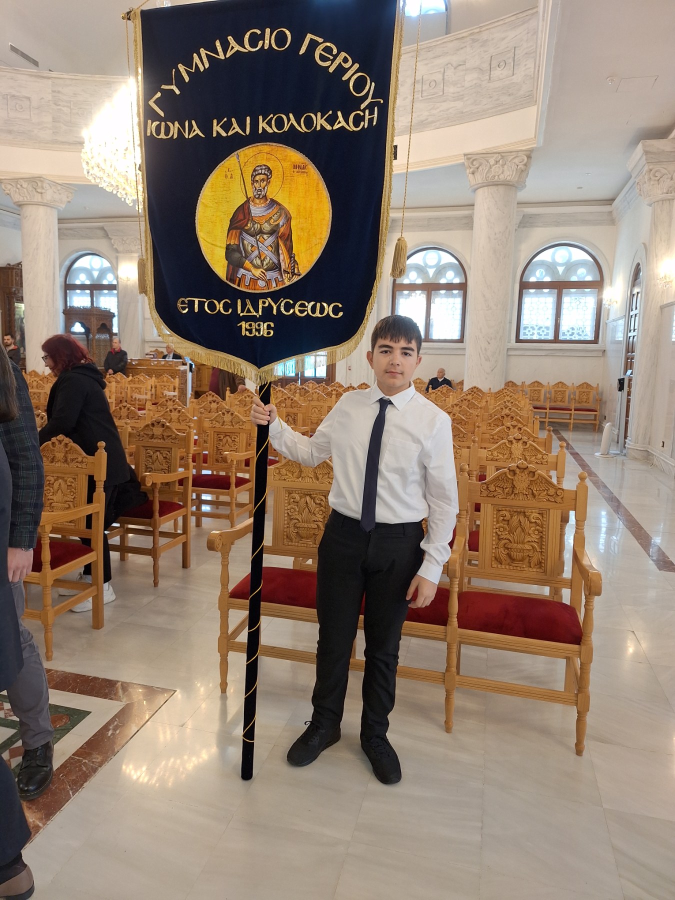 Την Τετάρτη 1η Απριλίου, το Σχολείο μας εκπροσωπήθηκε στην επίσημη δοξολογία στον Καθεδρικό Ναό Αποστόλου Βαρνάβα στη Λευκωσία, για την Εθνική Επέτειο της 1ης Απριλίου 1955-1959. Το λάβαρο του Γυμνασίου μας έφερε ο τελειόφοιτος μαθητής Παναγιώτου Χρίστος Γ3, με συνοδό καθηγήτρια την κ. Άλκηστη Τράχηλου.